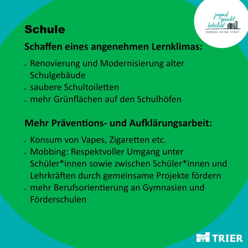 Schule und Beruf Berufsberatung und Praktika Jobs/ Nebenjobs für Jugendliche Unterstützung bei sozialen und psychischen Problemen in der Schule Aufklärung über Mobbing, Outing, queere Lebensformen… Moderner Unterricht mit Tablets und W-LAN Schulstoff Renovierung maroder Schulgebäude 2025 2024 2023